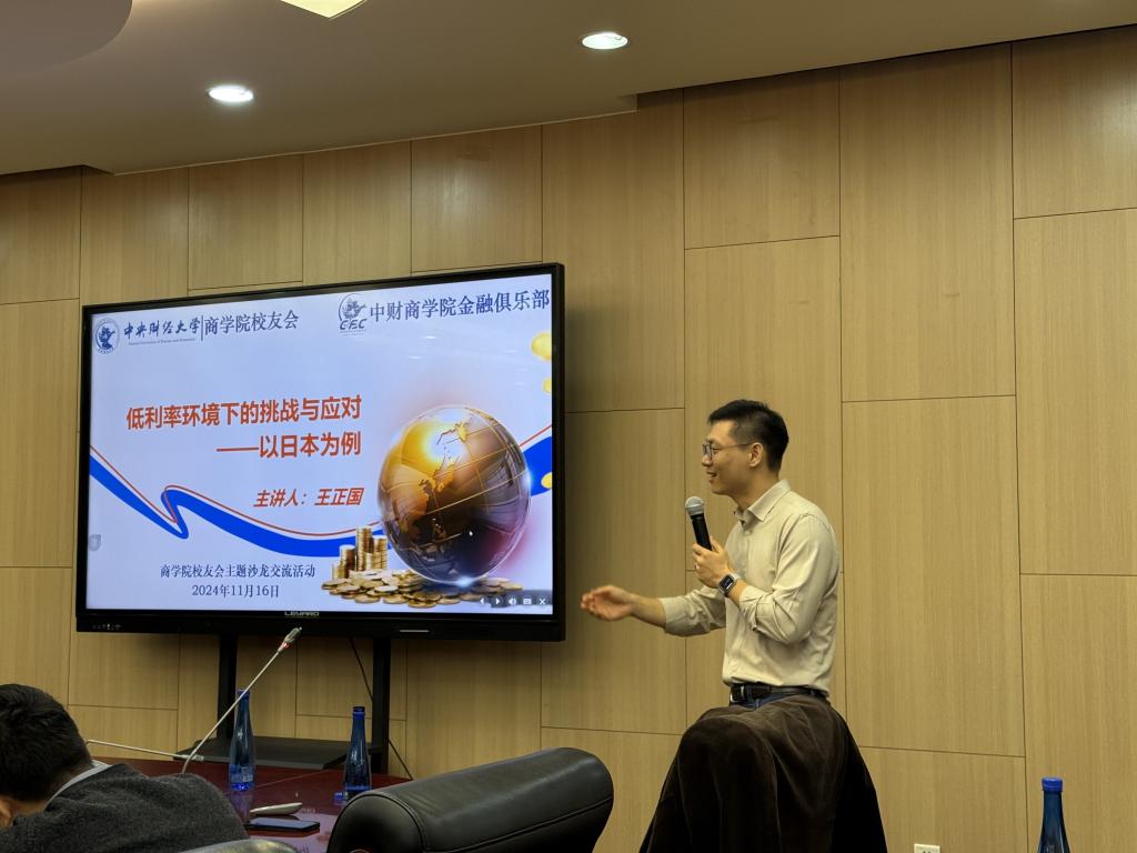 On the morning of 16th November, the Alumni Association of the Business School of Central University of Finance and Economics (CUFE) and the Finance Club of CUFE successfully held a very in-depth and forward-looking alumni salon activity. Dr Wang Zhengguo, Co-Head of Fixed Income Research Service Department of CITIC Securities, was invited to bring a knowledge feast to many alumni of CUFE Business School with the theme of ‘Challenges and Responses in a Low Interest Rate Environment - Taking Japan as an Example’. Yang Zhongying, Deputy Secretary of the Party Committee of the Business School of Central University of Finance and Economics (CUFE), and Professor Zhou Weizhong, Director of the China Enterprise Research Centre of CUFE, Professor and Doctoral Supervisor of the Business School, participated in the salon and listened to the lecture together with the alumni, which created a warm atmosphere and a strong academic atmosphere at the scene. The salon was hosted by Zhang Geng, President of Business School Alumni Association.